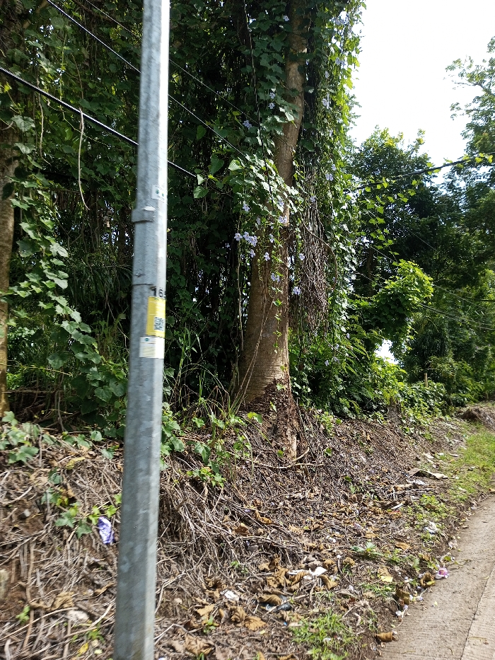 The scene depicts an outdoor environment in Kandenuwara, Sri Lanka, under daylight conditions. A grey, octagonal metal utility pole stands vertically on the left, bearing a yellow sticker with "164" and a QR code. Two dark utility wires extend horizontally from the pole into dense green foliage. The ground slopes upward from right to left, forming an embankment covered with dry leaves, twigs, and sparse green plants. A crumpled purple object rests near the base of the utility pole, and scattered white and pink litter is visible among the organic debris further right. A narrow, light-colored concrete or dirt path segment borders the bottom right edge of the frame. The midground and background consist of dense tropical or subtropical vegetation, including a prominent tree trunk in the center-right heavily entwined with vines and creepers displaying numerous small, light purple flowers. A bright sky is visible through gaps in the upper right foliage. No individuals or actions are depicted.