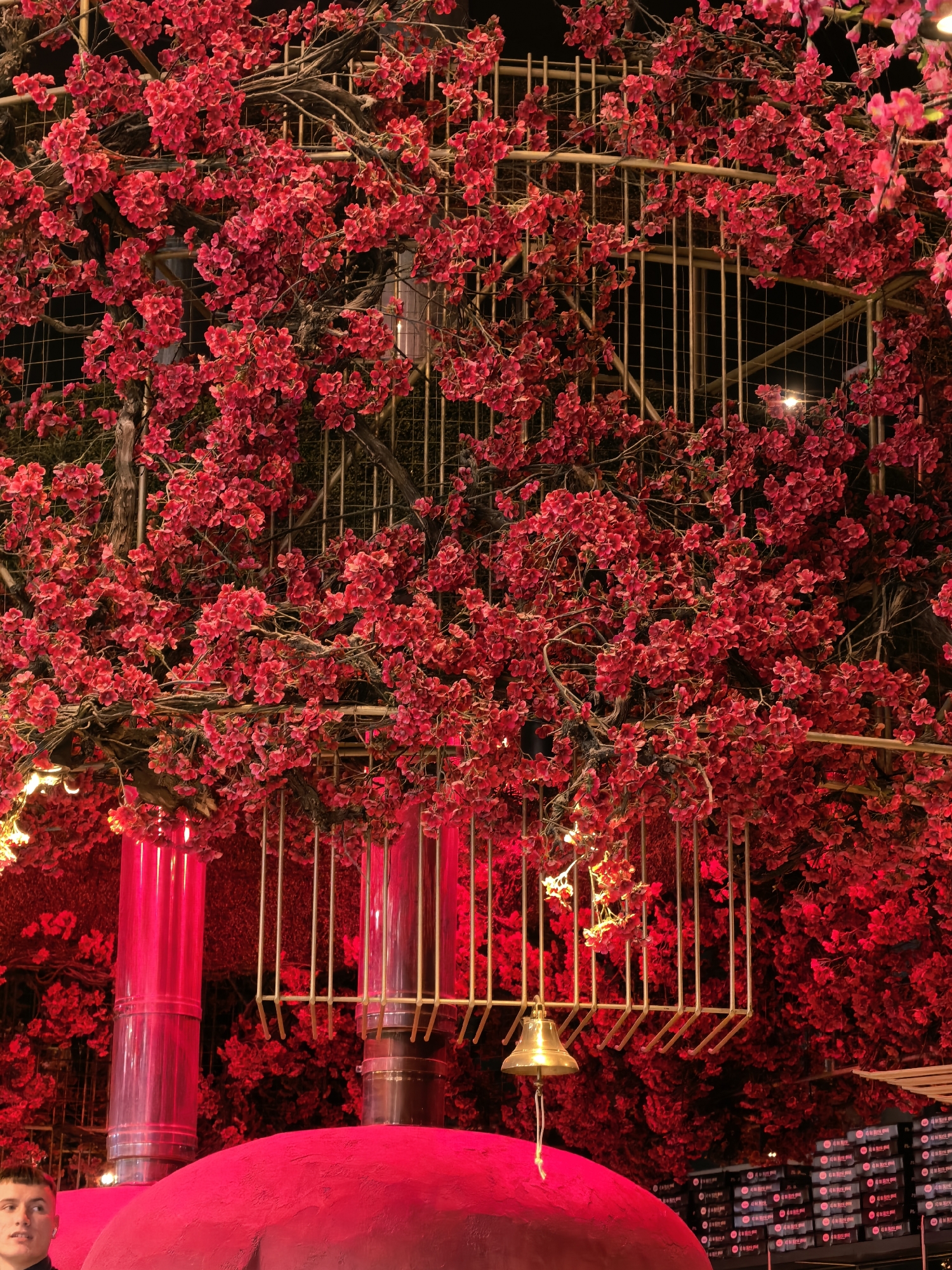 The image captures an interior or covered outdoor dining area at Sasa Asian Pub & Garden, located at ul. "Lege" 10, 1000 Sofia Center, Sofia, Bulgaria. The scene is dominated by a dense, overhead canopy composed of artificial red cherry blossom-like flowers, interspersed with bare branches, partially concealing a gold-colored metal grid support structure. The entire area is saturated with a reddish-pink ambient light, complemented by small, warm-toned string lights. In the lower central portion, a large, rounded, red-illuminated dome, consistent with a pizza oven, is prominent. Extending upwards behind this dome are two large, metallic cylindrical structures, likely exhaust pipes or chimneys, also bathed in red light. A brass bell, suspended by a white cord, hangs from the gold metal grid above and to the right of the pizza oven. To the lower right, multiple stacks of branded rectangular packages or boxes are visible. The lower-left foreground shows the partial profile of a male individual with short hair, looking slightly upwards and to the right. No specific actions or interactions are depicted beyond observation of the environment.