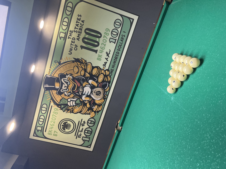 An angled, indoor shot depicts a pool table in the foreground and a large wall mural in the background