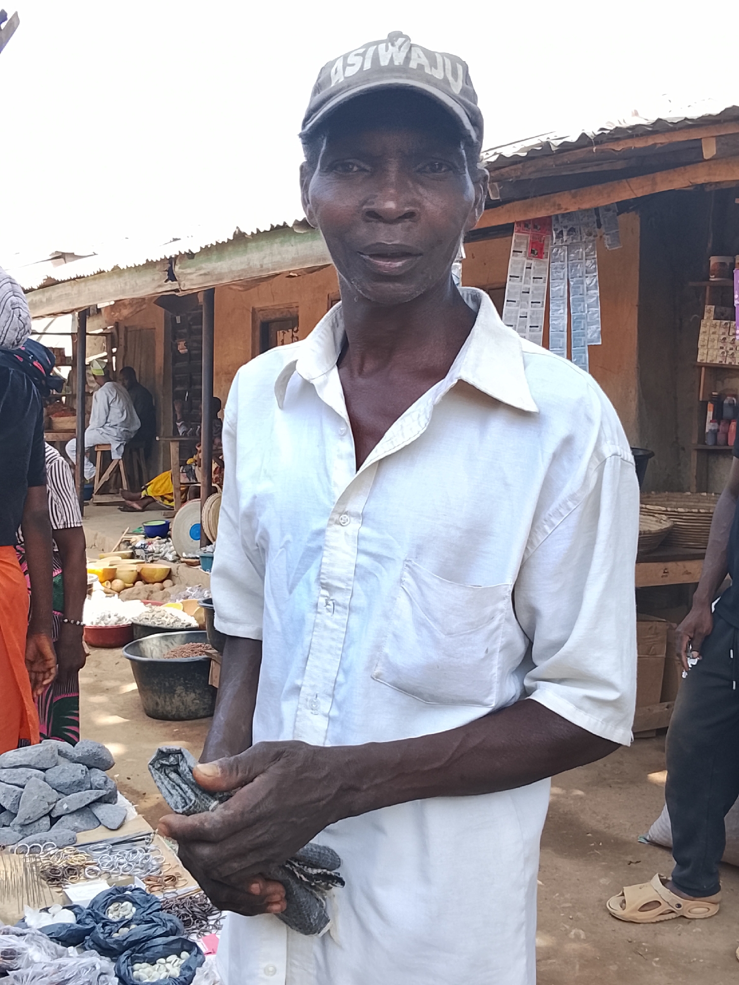 The image depicts an outdoor market scene in Akwanga, Nigeria. In the foreground, a dark-skinned adult male stands, looking directly at the viewer. He wears a light-colored collared shirt and a dark baseball cap with the word "ASIWAJU" visible on its front. His hands are clasped at waist level, holding a folded piece of dark fabric. To the left of the central figure, a ground-level market display presents various items for sale: piles of irregularly shaped grey stones, small bags containing white objects (possibly shells or seeds), numerous metal rings, and black plastic buckets filled with different dry goods such as grains or legumes. A partially obscured individual in a black top and orange lower garment stands near this display, while further in the background, another person in a light-colored garment is seated on a wooden stool. To the central figure's right, a market stall features small packaged goods hanging in vertical strips, likely sachets of consumer items, along with stacked boxes on shelves. A person wearing dark pants and light-colored sandals is partially visible on the far right. The background consists of simple, single-story structures with mud-colored walls and corrugated metal roofs. The ground is unpaved earth, and the scene is illuminated by bright daylight.