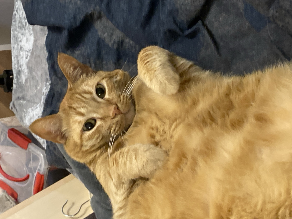 The scene is described as taking place in Balaklavsky District, Ukraine. It depicts an indoor domestic environment. The primary subject is an adult domestic cat with orange tabby markings. The cat is positioned on its back, exposing its belly, and is lying on a dark blue, textured fabric surface, possibly bedding. Its head is slightly elevated and turned towards the viewer, with both ears erect. Its eyes are open, displaying greenish-yellow irises and dilated pupils. Distinct white whiskers extend from its muzzle. The cat's front paws are partially curled towards its chest. In the upper left background, a clear plastic storage container with visible red latches or handles is present. Below and to the left of the cat's head, a light-colored, possibly wooden or cardboard, flat object leans vertically. A silver-colored, hooked metal hanger is also visible in this area. Behind the cat's head and to the upper right, a lighter greyish-blue fabric or blanket is visible. No human figures are present in the image.