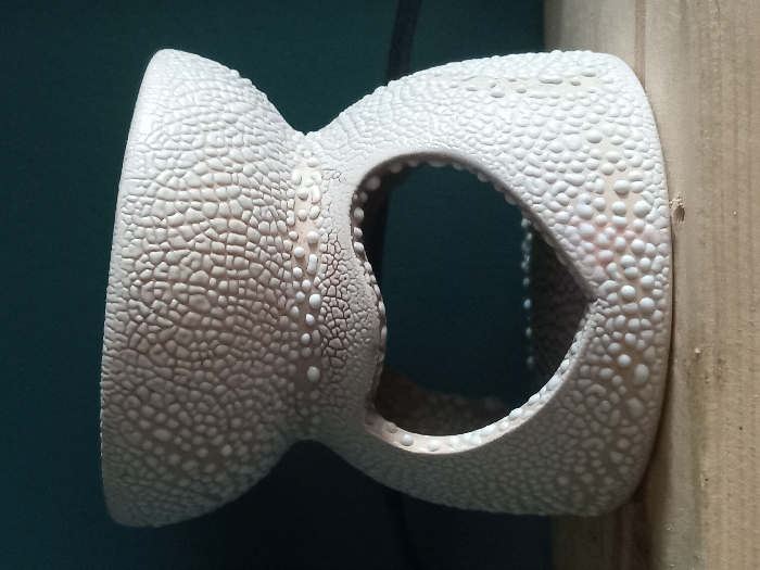 Meknes, Morocco: A single, off-white ceramic oil burner, characterized by an hourglass-like silhouette, rests on a light-colored wooden surface. The object's exterior is covered in numerous small, raised, irregular bumps, creating a uniformly textured surface. A heart-shaped cutout penetrates the lower front section of the burner. The ceramic exhibits slight pinkish discoloration in localized areas, particularly within the heart aperture and near the base. The wooden surface displays visible grain patterns and minor debris. The background is an out-of-focus, solid dark teal wall. No people or actions are depicted.