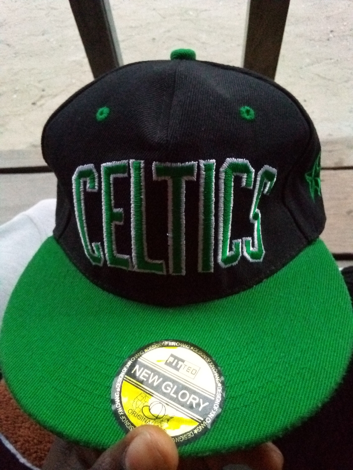 A black and green snapback style cap is the central subject, held by a person's dark-skinned left hand, with the thumb and index finger visible on the lower brim. The cap features a black crown with a green button on top and two visible green eyelets. The word "CELTICS" is prominently embroidered on the front in white lettering with a green outline. The brim of the cap is solid green. A circular yellow sticker with a white border is affixed to the green brim, displaying text that includes "FITTED," "NEW GLORY," "ORIGINAL," and "DESIGN OF XIN CHANG." The background is out of focus, showing a light-colored, possibly concrete or tiled surface, and a dark, vertical structural element, likely a metal beam or frame. The image does not contain any discernible features to identify its specific location within the city of Ojo, Nigeria.