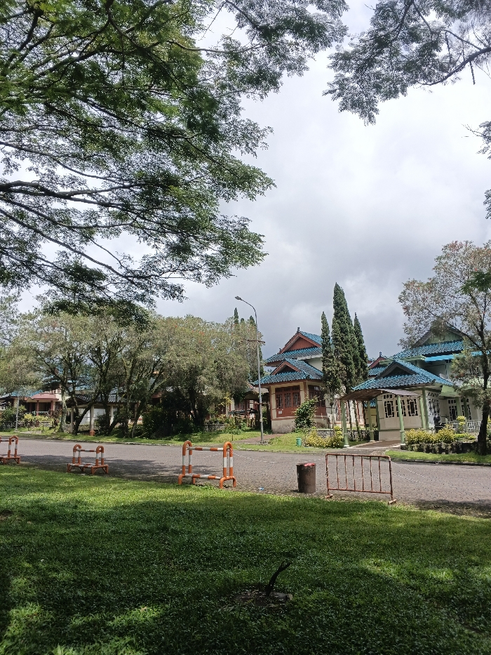 The image displays an outdoor scene in ឃុំ ផាត់សណ្ដាយ, Cambodia, under an overcast sky. The foreground consists of a vibrant green lawn, where a dark, broken branch or stump is visible near the bottom center. A paved, dark grey asphalt road traverses the midground, curving from left to right. Three portable orange and white striped road barriers are positioned on the grassy verge to the left of the road. On the right side of the road, a rusty metal barrier stands adjacent to a dark, cylindrical object, possibly a bollard or bin. Beyond the road, a cluster of multi-story buildings with distinctive traditional Southeast Asian architecture is visible. These structures feature prominent gabled roofs in a teal color, light-toned walls, and dark brown accents around windows and doors. One building on the far right includes a covered exterior walkway. The environment is heavily vegetated with various trees: a large deciduous tree with green foliage dominates the upper left and center, while numerous smaller trees line the road and dot the landscape around the buildings. Several tall, slender coniferous trees are clustered near the buildings on the right. A black street light pole with a luminaire is visible on the left side of the road, with a utility pole positioned further back amidst the trees. No individuals are present in the scene.