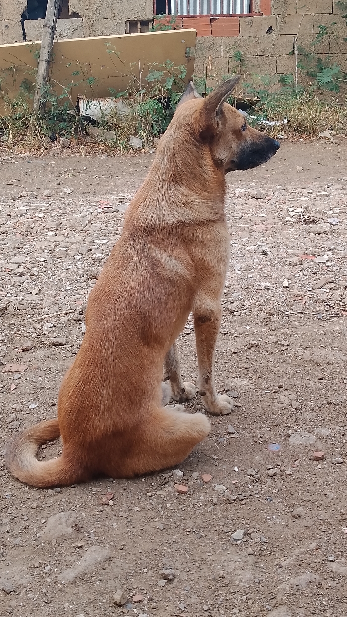 - "A reddish-brown dog, appearing to be a mixed breed with erect ears and a dark muzzle, sits in profile on a dry, gravelly dirt surface" by FM-ymGPj1, licensed under CC BY 4.0