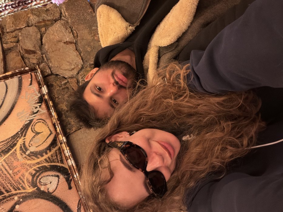 This image depicts two individuals positioned closely in an indoor setting. In the foreground, a female subject with long, wavy, light brown hair is visible, wearing dark tortoiseshell-patterned cat-eye sunglasses and a dark blue hooded sweatshirt. She exhibits a slight smile and wears small silver hoop earrings. Partially visible behind her to the right is a male subject with dark hair and a light beard, dressed in a dark hooded sweatshirt and a dark jacket featuring a prominent light beige/cream shearling collar and lapel. Both individuals are looking towards the camera. The background reveals a rustic stone wall composed of irregularly shaped, light-colored stones. Above the stone wall, a framed piece of artwork is visible, displaying a graffiti-style design with a peach background, black outlines, swirls, and two heart motifs, bordered by a metallic frame. The scene is located in the city of Les Allues, France; the specific establishment within the city is not identifiable.