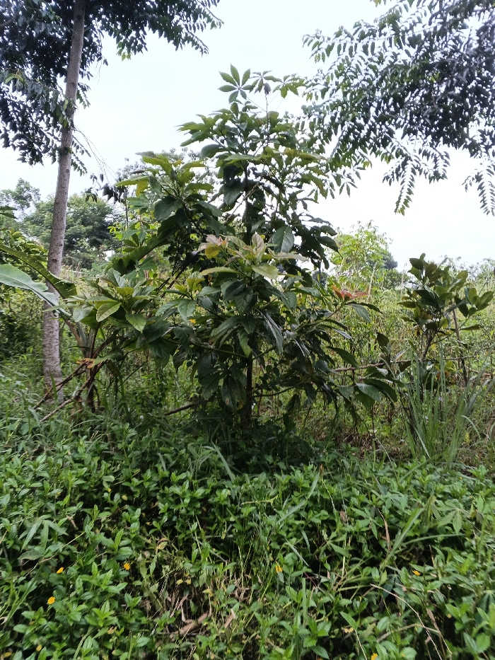 This image depicts a dense, natural outdoor environment, consistent with green spaces found within or on the outskirts of Chengdu, China. The scene is dominated by lush green vegetation under an overcast sky. In the mid-ground, a prominent multi-stemmed plant or small tree stands centrally, featuring broad, dark green leaves. Lighter green and reddish-brown new growth is visible at its upper sections. To the left, a slender tree trunk with light-colored bark rises vertically, extending out of the frame, with its dark green canopy partially visible at the top left. Denser, mixed green foliage forms the background, suggesting a wooded area or thicket. The entire lower portion of the image is covered by a thick carpet of various small green leafy plants and grasses, interspersed with sparse, small yellow blossoms, particularly in the lower left quadrant. No human figures, animals, man-made structures, or direct actions are depicted. The lighting is even, consistent with an overcast day.