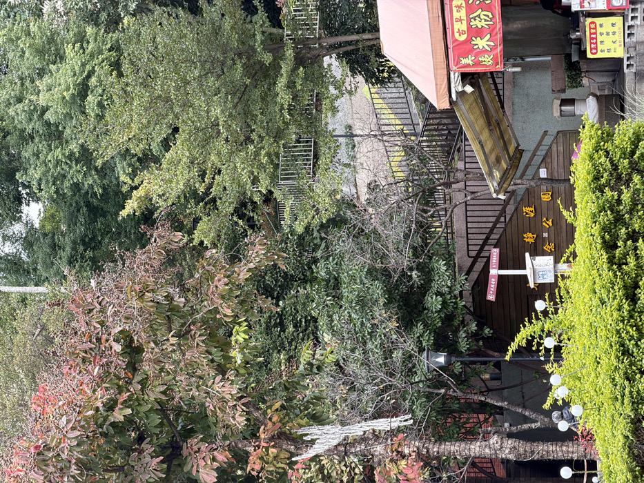 An overhead view captures a scene with a variety of greenery. Trees with varying shades of green and some with hints of red and brown leaves dominate the left side. A metal staircase leads to a pathway. On the right, a building with an awning and signage in Chinese characters is visible, partially obscured by a lush green bush. A decorative lamp post and a wooden wall with more Chinese characters add to the scene's cultural flavor.