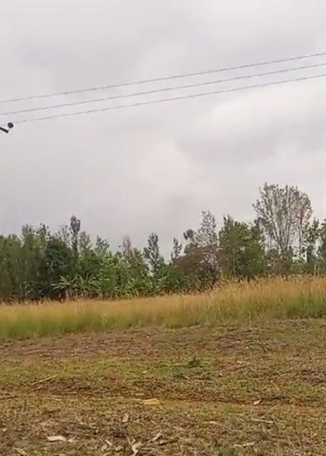 rural landscape on a cloudy day. In the foreground, there's a patch of grassy land, partly brown with some exposed soil. To the right, a tree trunk stands, its bark rough and textured. A line of trees, mostly green, stretches across the middle distance. A utility pole with power lines running parallel to the horizon is visible on the left side of the frame. The sky is overcast, filled with grey clouds. There are no people visible in the scene.