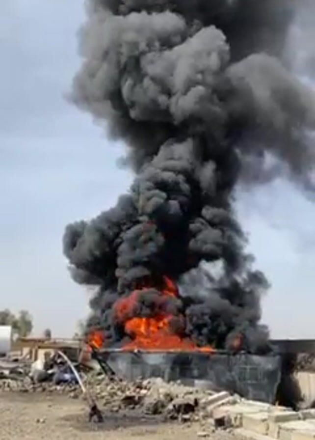 massive fire, billowing thick, black smoke high into the sky. The fire appears to be contained within a large, round structure made of gray, rectangular blocks. The structure sits in a barren, gravel-covered area with debris scattered around. In the background, there are glimpses of other structures and vegetation. The sky is overcast, and the overall scene depicts a destructive event.