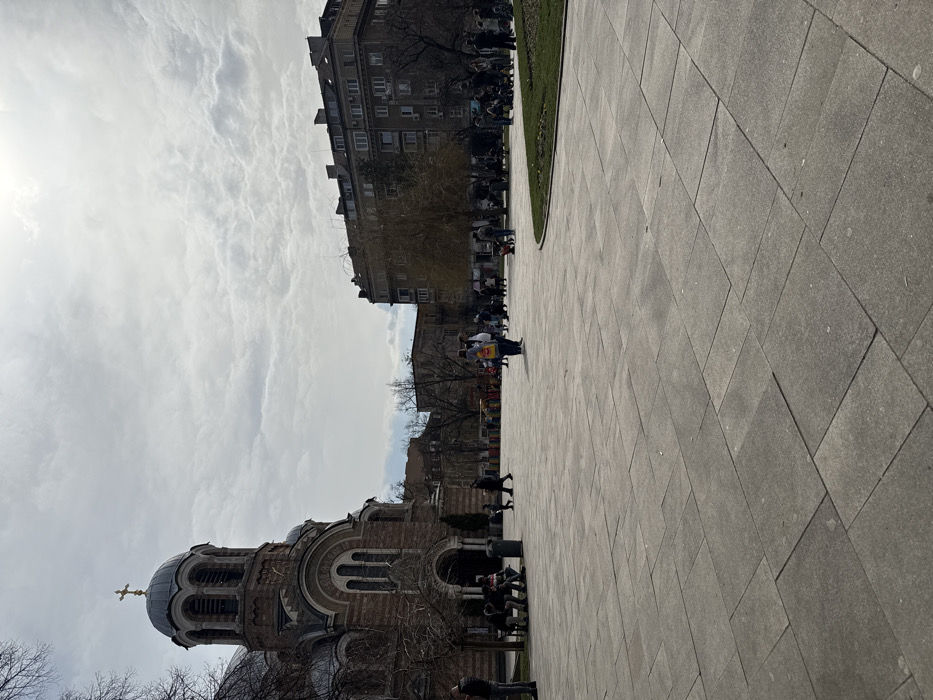 The image depicts a public square in Sofia, Bulgaria, specifically the area surrounding the St