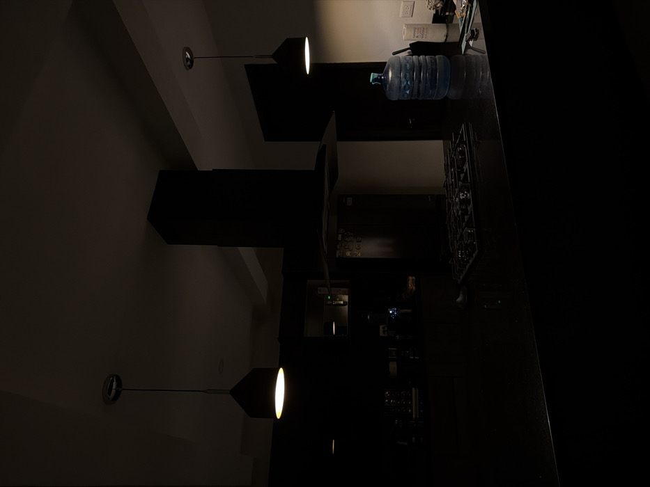 dimly lit kitchen with black cabinets and appliances. Two hanging lights illuminate the scene. A large water bottle sits on the countertop, near some smaller containers and miscellaneous items. A stovetop with a grill rack is visible. The overall mood is dark and modern, with the focus on the stark contrasts and geometric shapes of the kitchen elements.
