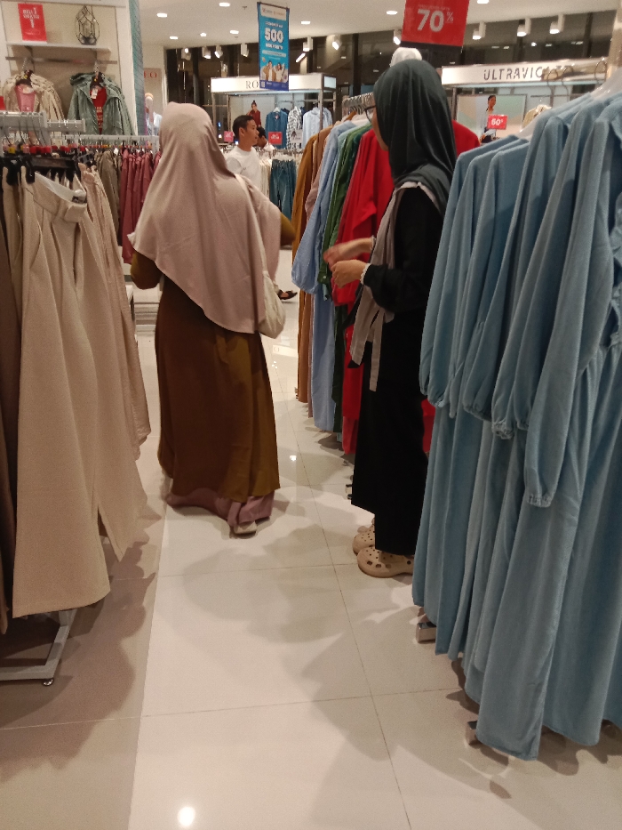 The scene is in a clothing store in a shopping mall in Kecamatan Mijen, Indonesia (latitude: -7.045, longitude: 110.324). There are two women in hijabs shopping for clothing. One woman is wearing a brown abaya, the other is wearing a black abaya. The woman in the brown abaya is looking at clothes on a rack. The woman in the black abaya is looking at clothes on the other side of the store. There are many clothes on racks in the store. The clothes are mostly light blue, beige, and brown. There are signs for clothing sales around the store, including a sign that says "70% off". The floor is white tile. There is a man in the background, standing behind the woman in the brown abaya. The lighting is bright, and the store seems to be crowded.