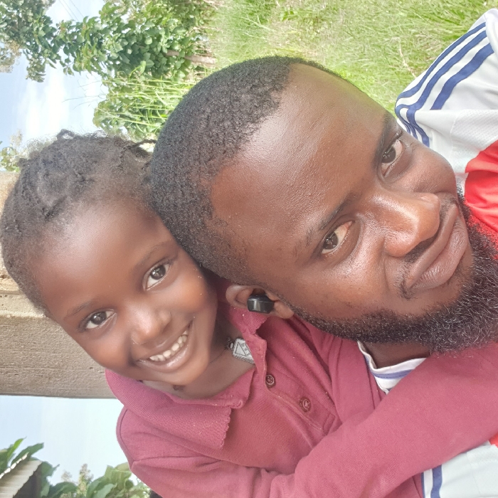 This image depicts an adult male and a child outdoors in the city of Kaninkon, Nigeria