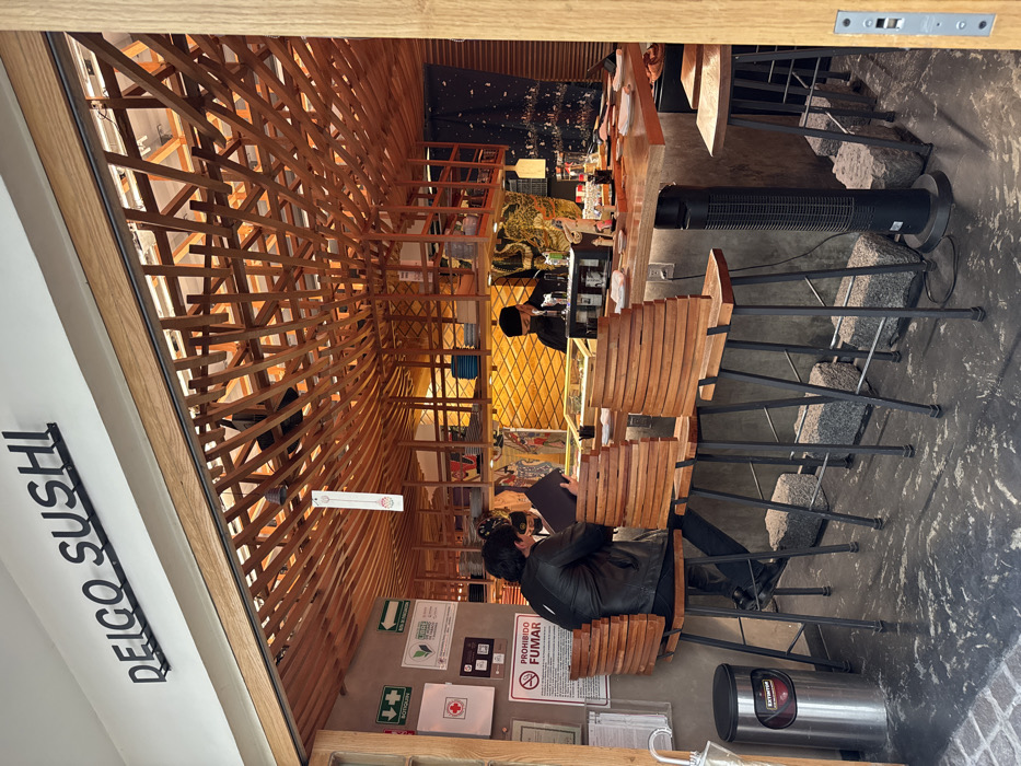 Inside the "Reigo Sushi" restaurant, a unique wooden structure forms the ceiling