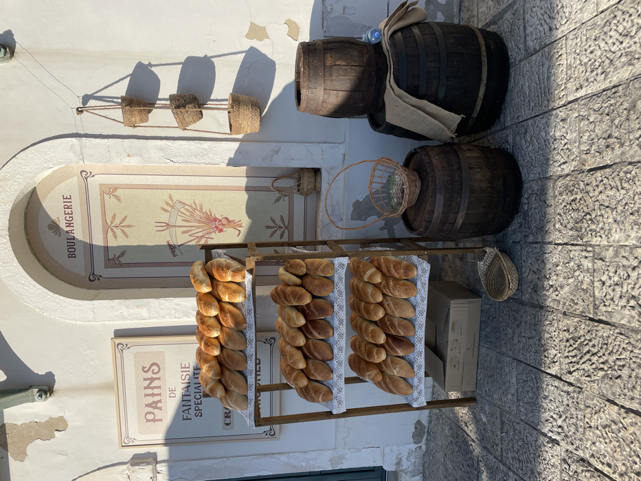 This image depicts an outdoor bakery display situated against a white stucco wall in a city identified as Herceg Novi, Montenegro. The ground is paved with cobblestones, and the scene is illuminated by direct sunlight, casting distinct shadows. In the foreground, a three-tiered wooden display stand holds numerous baguette-style loaves or rolls. Each tier is covered with a white, lace-edged cloth, upon which the bread is arranged in neat rows. Approximately 15-16 loaves are visible on each of the three shelves. Beneath the lowest shelf of the stand, a brown cardboard box is visible on the cobblestone ground, next to a small, shallow woven basket. Behind the bread stand, a large framed sign is mounted on the wall to the left. The visible text on this sign reads "PAINS DE FANTAISIE SPÉCIALITÉ" and partially "CROISSANTS". To the right of the sign, an arched niche or doorway is painted with "BOULANGERIE" above a decorative motif featuring wheat stalks and possibly other produce. The white wall exhibits areas of peeling paint. To the right of the arched entrance, three small, straw-colored woven baskets are suspended vertically by ropes from a fixture on the wall. Further to the right and slightly forward, three wooden barrels are arranged on the cobblestones. Two larger, darker wooden barrels stand upright; one forms the base for a smaller, similarly colored barrel placed on top. A piece of light brown burlap fabric is draped over the top edge of the lower barrel on the right, and a transparent plastic water bottle with a blue cap rests on the burlap. A round, woven basket with a handle is positioned on top of the middle barrel. No people are visible within the frame, and no explicit actions or interactions are depicted.