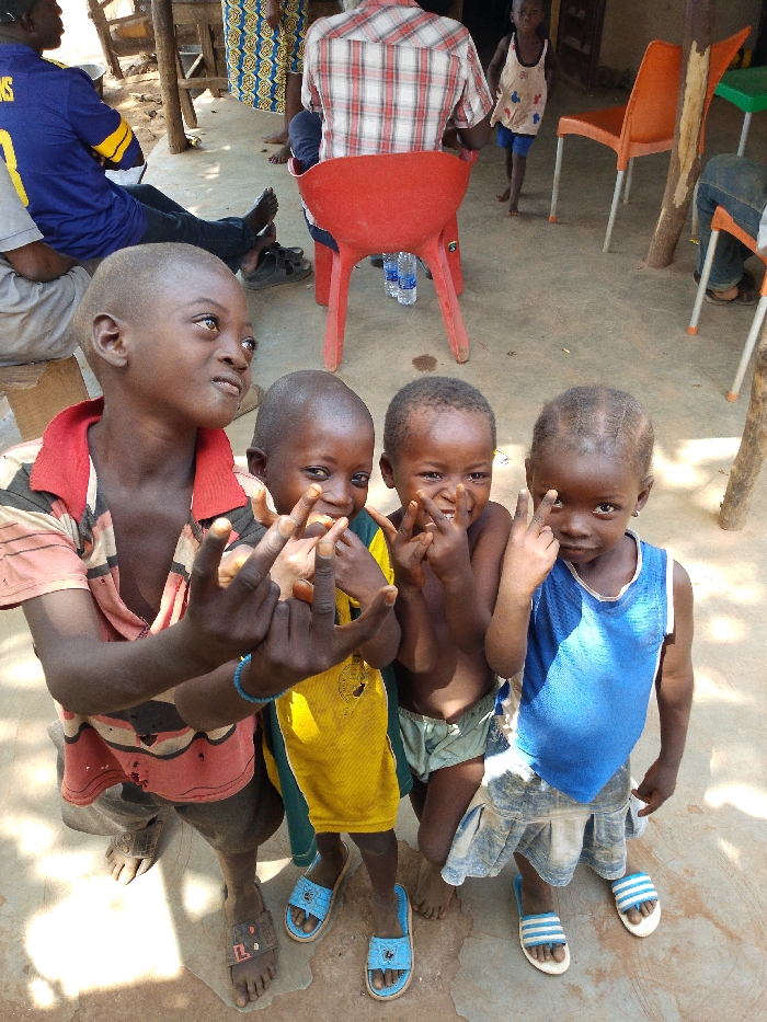 The scene is set in Oduma Hill, Nigeria, depicting an outdoor communal area with a light-colored, possibly concrete or packed earth ground under direct sunlight. In the immediate foreground, four children with dark skin tones are standing and posing for the camera. 1. The leftmost child, a male, wears a red and white striped polo shirt and dark sandals. He makes a "rock-on" hand gesture with both hands, looking slightly to the upper right. 2. Adjacent to him, a younger male child wears a yellow shirt and light blue slide sandals, making the same "rock-on" gesture with both hands and smiling towards the camera. 3. Next, another male child, bare-chested with light green shorts, mimics the "rock-on" gesture with both hands, also smiling at the camera. 4. The rightmost child, a female, wears a blue tank top, a light-colored skirt, and white and blue striped slide sandals. She makes the "rock-on" gesture with her right hand and looks directly at the camera. In the mid-ground and background, several adults and a youth are present: * To the left, a male individual wearing a blue shirt with yellow markings is seated on a low surface, facing away from the camera. His dark sandals are on the ground beside him. * In the center-background, another male individual wearing a red and white plaid shirt is seated on a red plastic chair, also facing away. Two plastic water bottles are visible beneath his chair. * Further back on the right, a younger individual in a light-colored tank top and blue shorts is standing. * Additional partial figures and limbs are visible, suggesting more individuals are present within the broader scene. The environment includes several brightly colored plastic chairs (red, orange, green) and wooden support posts, indicating a simple, possibly semi-covered structure.