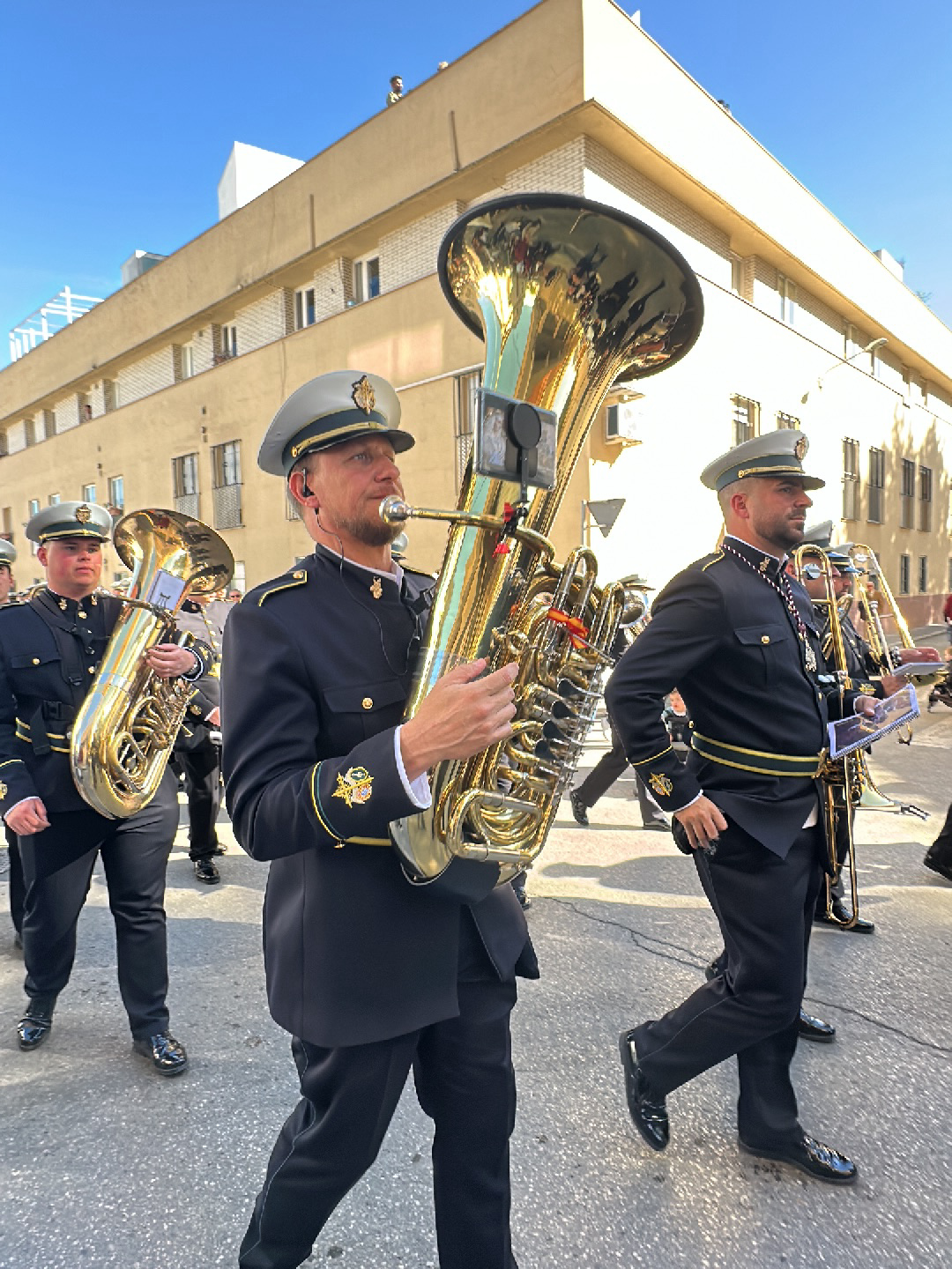 The image captures a brass band parading in Jerez de la Frontera, Spain, as evidenced by the architectural style of the buildings in the background. The band members wear dark-colored uniforms with gold trim and matching peaked caps. The central figure plays a tuba with a black attachment affixed to its bell. Other band members, also playing tubas and trombones, surround him. The setting appears to be a city street, with a building featuring multiple windows and a light-colored facade in the background. The sky is clear and blue, suggesting daylight. The band members appear to be marching or walking, performing as they proceed.