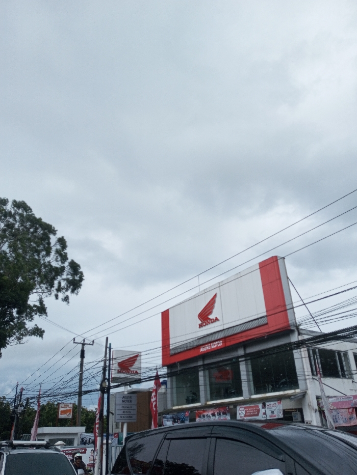 This image depicts a street scene in Cipendawa, Indonesia, observed under an overcast sky with dense grey cloud cover. The primary subject is a multi-story building featuring a Honda motorcycle dealership. A large, rectangular billboard on the upper facade displays the red winged Honda logo and "AGUNG MOTOR" in red text against a white background with red trim. A smaller, square sign with the Honda logo and "AGUNG MOTOR" is visible at ground level to the left. The building's lower floor features large glass display windows, behind which motorcycles are visible. Red banners and flags are present around the building. A utility pole, heavily laden with numerous entangled black electrical and communication wires, stands prominent in the middle-left of the frame. In the foreground, the side of a black minivan or SUV occupies the lower right, and a portion of a white vehicle is visible on the lower left. A single individual wearing a helmet is partially visible on a motorcycle, situated behind the white vehicle. A large tree with dark green foliage is positioned on the far left of the frame.