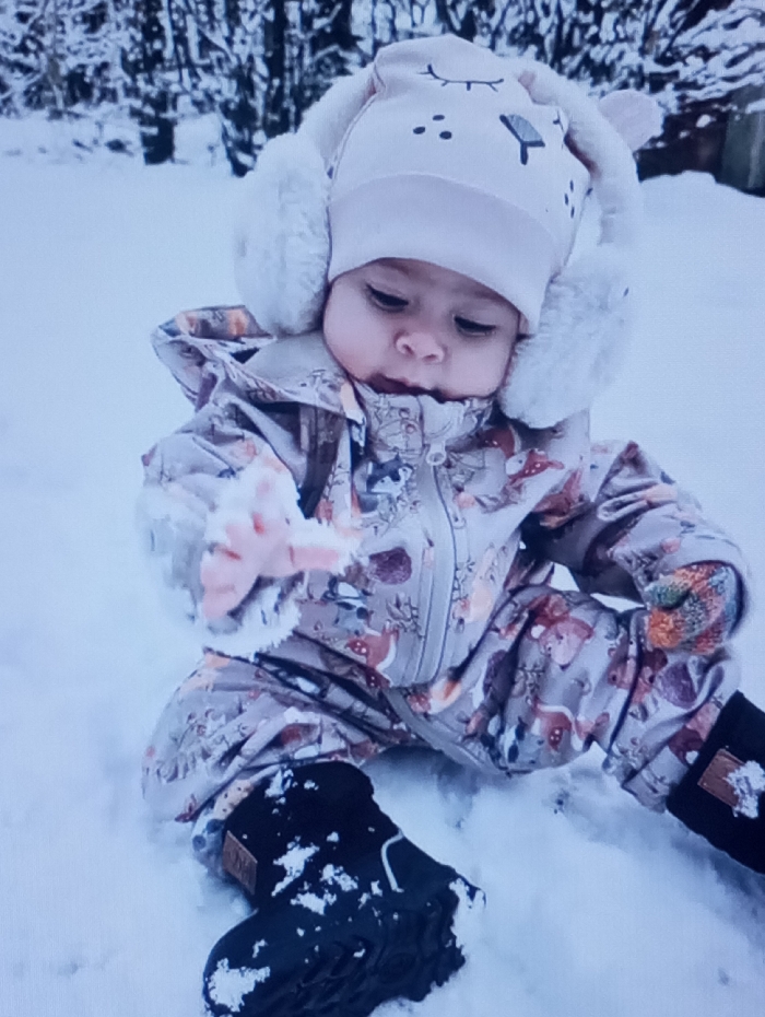 An infant is seated in deep snow in Riga, Latvia. The infant wears a light-colored hat with a stylized animal face design and prominent white fluffy earflaps. A one-piece snowsuit, patterned with forest animal motifs in muted tones, covers the body. Dark, textured winter boots are on the feet, partially snow-covered. The infant extends its left hand forward, covered in snow. The background features out-of-focus, snow-covered trees and vegetation, consistent with an outdoor winter setting.