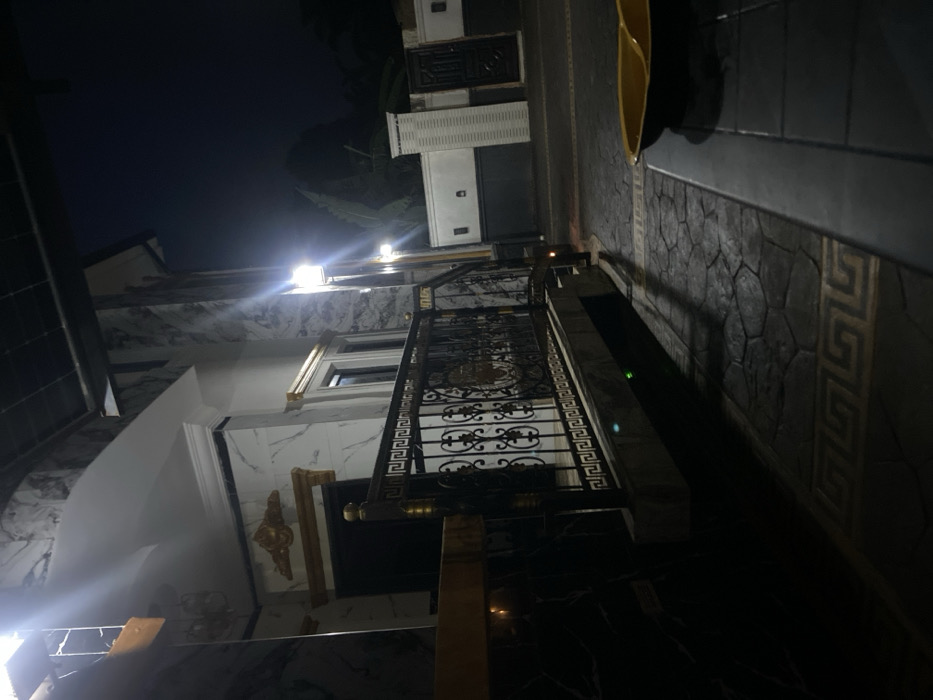 A low-angle nighttime shot depicts an ornate wrought-iron gate with Greek key detailing. The gate is framed by marble-clad pillars. To the left, a building facade features white marble panels, gold accents, and a bright window. The paving stones exhibit a rough texture and a Greek key pattern runs along the edge. Further up, a white structure with black detailing can be seen, lit by street lights against a dark sky. A yellow object is visible on the right side.