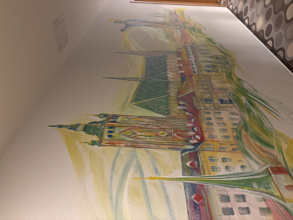 A large, colorful mural depicting iconic Prague architecture is painted on a plain white interior wall, angled from the lower left to the upper right