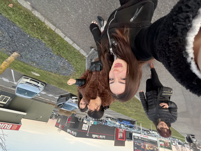 A low-angle selfie captures three females walking on a paved sidewalk next to a retail parking lot in Vendenheim, France, under a clear, late-day sky