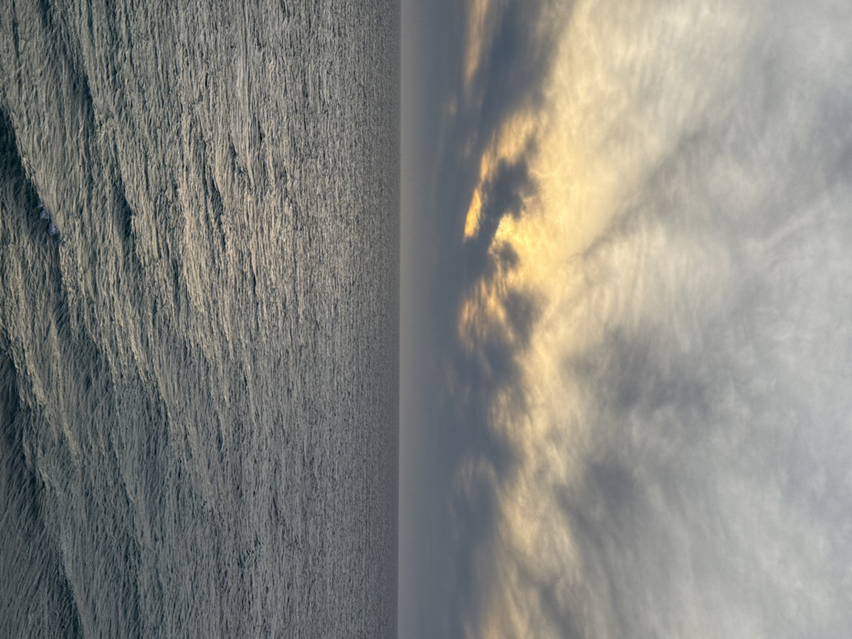 This image depicts a wide expanse of the Black Sea, observed from the city of Anapa, Russia. The scene is dominated by a clear horizon line separating the water from the sky, with approximately the lower half dedicated to the sea and the upper half to the sky. The sky is heavily overcast with multiple layers of clouds. In the upper portion, lighter gray and white cirrus or altocumulus clouds are present. Below this, a dense band of dark gray altostratus clouds stretches across the middle of the frame. A prominent, irregular opening within this dark cloud layer reveals a strong golden-yellow light source, indicative of a sunrise or sunset, casting bright illumination horizontally across the lower cloud band and suggesting a hidden sun. The sea surface is dark gray-blue, reflecting the muted light of the sky. It is characterized by numerous small, irregular waves and ripples, creating a textured pattern across the water. No large swells or breaking waves are visible, suggesting relatively calm conditions. The light from the sky reflects faintly on the water's surface, creating subtle glints and variations in tone. No landmasses, vessels, human figures, or man-made objects are visible within the frame. The perspective suggests a view from an elevated position, looking directly out over the open water.
