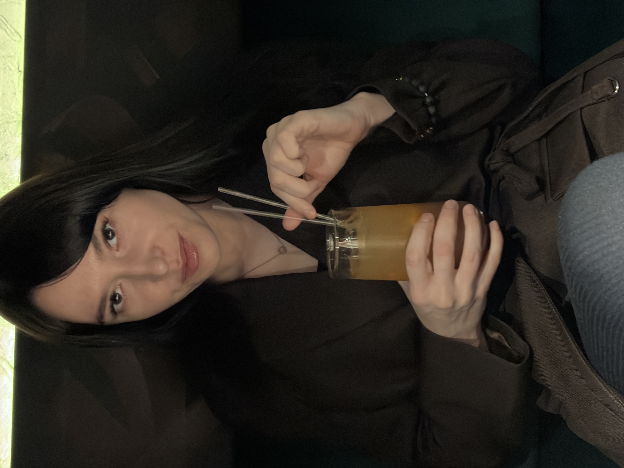 A woman is seated, holding a glass of a yellow liquid, possibly a cocktail, with two clear straws in it. She has long, dark hair with bangs and is wearing a dark brown shirt or jacket. She appears to be indoors, seated against a dark green textured surface, likely a chair or booth. A glimpse of what may be a window with a light green hue is visible to the left. The woman seems to be looking directly at the camera. There are no specific visual cues confirming the location in Chaikovsky, Russia.