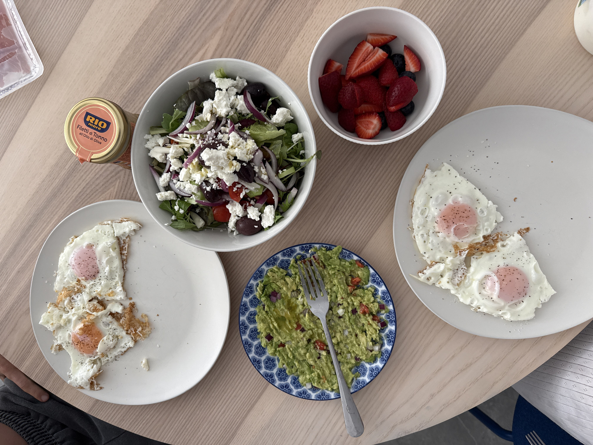 The image presents a top-down view of a dining table laden with food. A bowl of salad with lettuce, red onion, olives, tomatoes and feta cheese sits at the center-left. Adjacent to it is a jar of "Rio Filetti di Tonno all'Olio di Oliva". A bowl of strawberries and blueberries is placed near the top. Two plates hold fried eggs, one with eggs that appear more cooked and crispy, the other with eggs that have softer yolks. A plate of guacamole, with a fork resting on top, is placed between the two egg plates. The setting appears to be an indoor dining area with a light-colored wooden table. The presence of the foods indicates a meal setting. The image does not provide any clues about the location being in Livadia Larnakas, Cyprus.