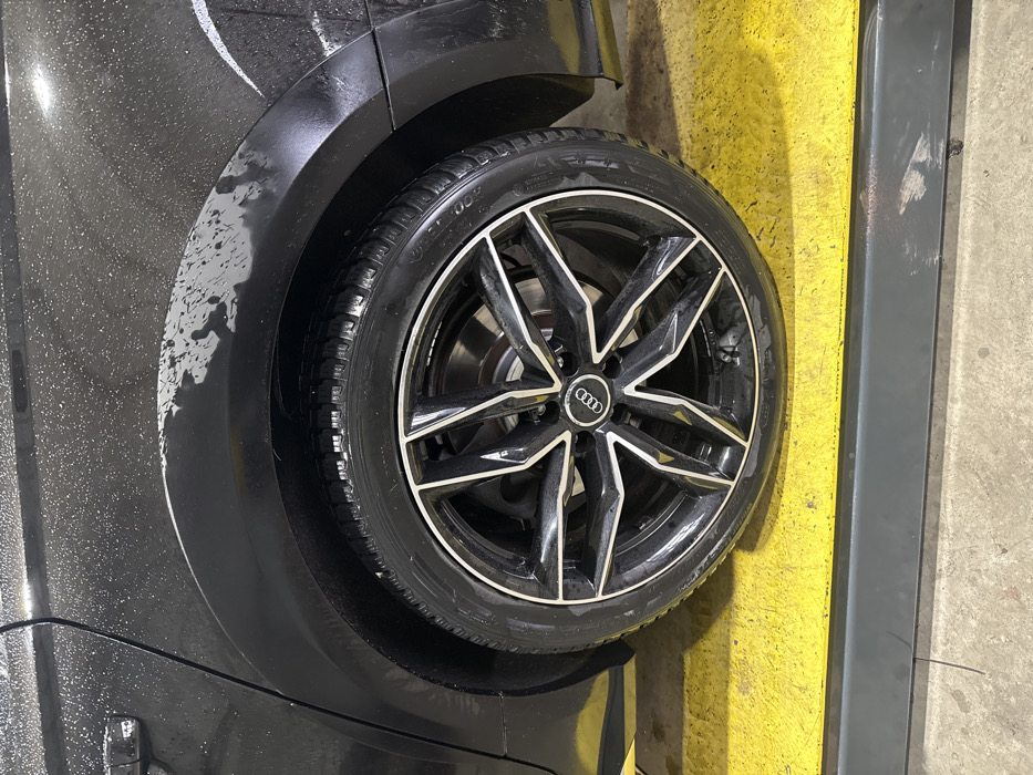 The image displays the rear passenger side of a dark-colored Audi vehicle, likely an Audi RS 6 Avant based on the fender flare design