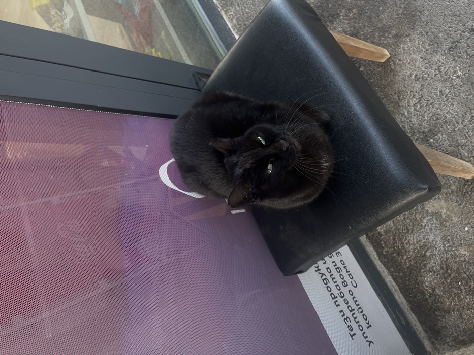 - "A black domestic short-haired cat with prominent green eyes and white whiskers is seated in a loaf position on a small, rectangular stool with a black upholstered cushion and two visible light-colored wooden legs" by FM-qlfhy1, licensed under CC BY 4.0