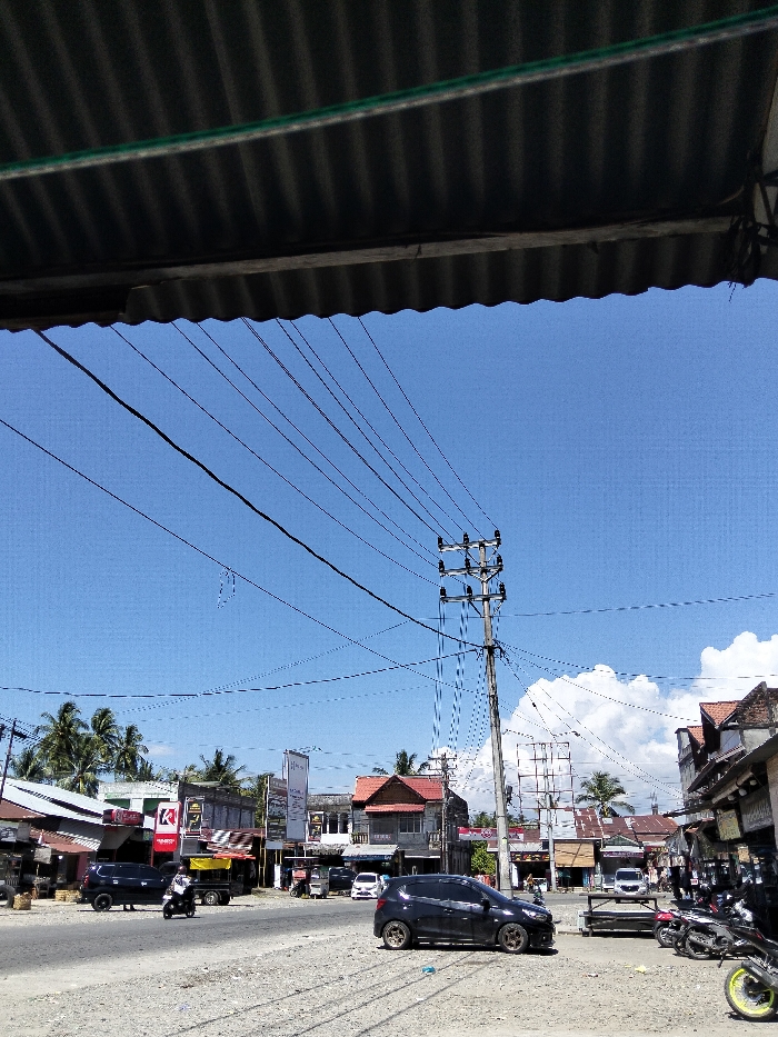 An outdoor shot shows a street scene with a focus on utility lines and a pole dominating the clear blue sky. Buildings line the street, featuring a mix of commercial and residential architecture. Vehicles include a dark car, a motorcycle, and parked motorcycles along the roadside. The foreground displays a rough, gravelly texture, contrasting with the smoother road. Overhanging roof structures partially frame the upper portion of the view.