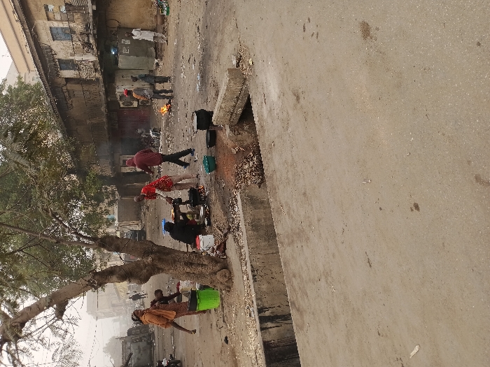 A street scene displays people cooking and walking amidst trash and debris. A small fire burns nearby. Buildings line the background, showing signs of weathering and age. A tree with bare branches dominates the foreground. The ground appears worn and uneven with a large concrete block on the right side. The overall scene conveys a sense of urban poverty.