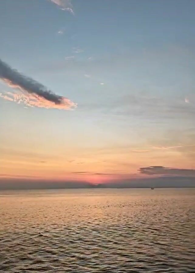 view of the ocean at sunset. The sky is a mix of blue, orange, and pink hues, with some clouds scattered across it. The sun is setting on the horizon, casting a warm golden light on the water. The water is calm with gentle waves. There is a small boat visible in the distance.