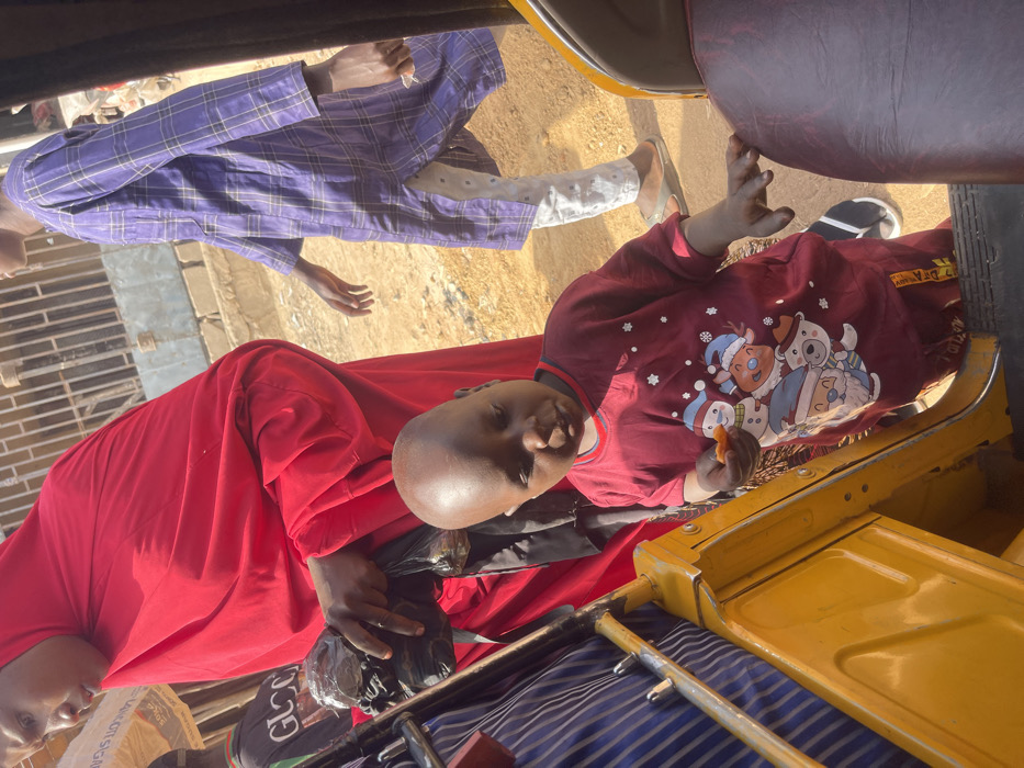 Two people are riding in a yellow tuk-tuk. One wears a red head covering and matching robe, holding a black plastic bag. A child next to them, clad in a maroon pajama top with cartoon characters, nibbles on something orange. Above, another person is visible, wearing a purple plaid top and white pants. The scene appears to be outdoors, in bright daylight, capturing the casual atmosphere of a ride in a developing area.