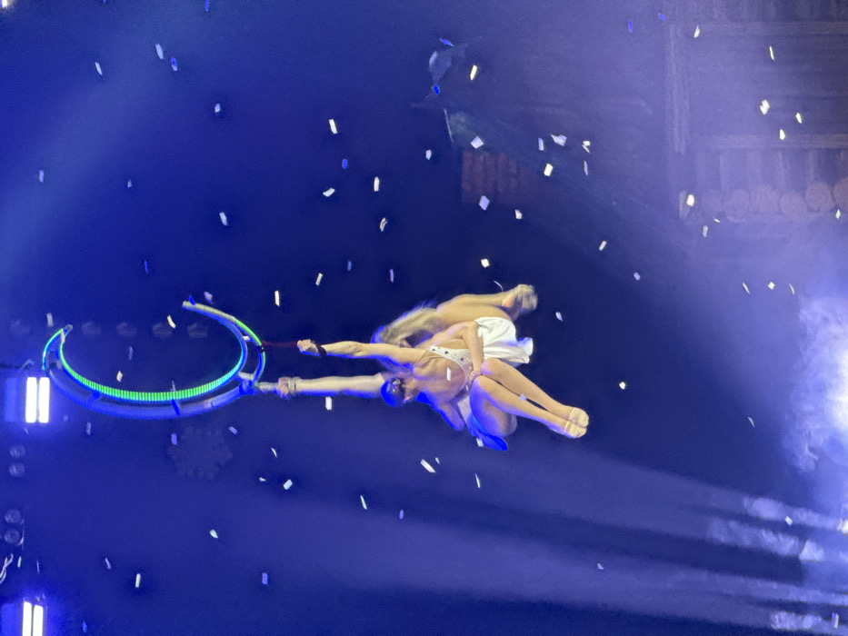 - "The image captures two female aerialists performing mid-air on a crescent-shaped aerial apparatus within an indoor performance venue in Unknown, Russia" by FM-j2hvk2, licensed under CC BY 4.0