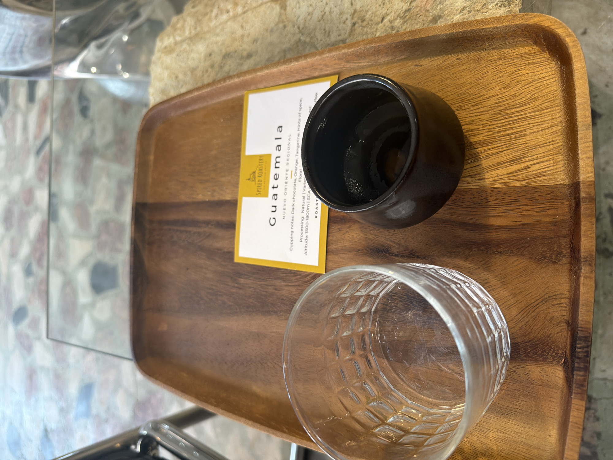 Here's a detailed description of the image: **Scene:** A top-down shot on a wooden tray. **Objects:** * A small, dark brown, ceramic cup. * A clear, glass cup with a textured, diamond-patterned design. * A yellow and white information card labeled "Spired Roastery Guatemala NUEVO ORIENTE REGIONAL" with tasting notes. * A wooden tray with a curved edge and a natural wood grain pattern. **Environment:** * A partial view of a polished stone countertop * Partial view of a glass window/divider **Inferred Details:** *The location cannot be inferred from the picture, because there are no details in the picture that specify the location of Brasov, Romania.* The scene suggests a coffee tasting or presentation setup. The cups and the card with tasting notes indicate that the items are related to coffee.
