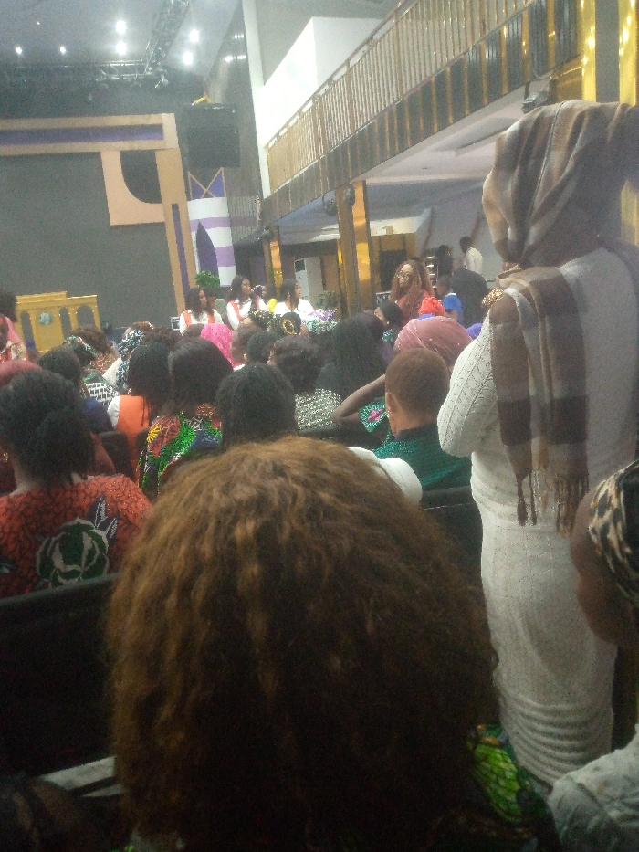 This image depicts a crowded indoor gathering in a large hall or auditorium in Ado, Nigeria