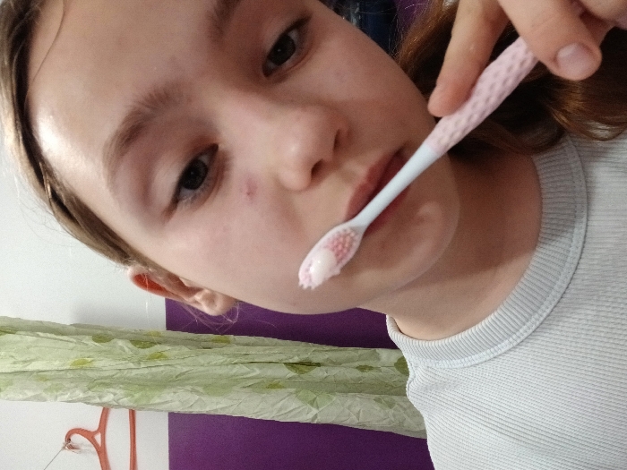 - "A girl is shown from the neck up, holding a pink and white toothbrush with toothpaste on the bristles near her mouth" by FM-8PLDS2, licensed under CC BY 4.0