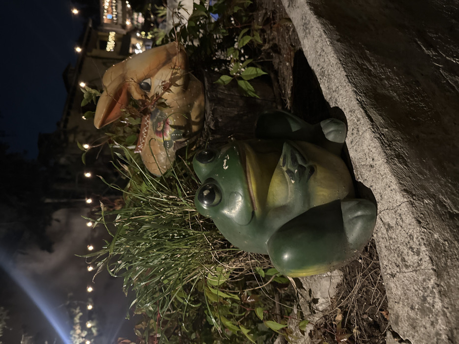 A nighttime photograph taken in Santa Cruz Aquiahuac, Mexico, depicts an outdoor decorative scene. In the foreground, a green and pale yellow frog statue is positioned on a grey, textured concrete ledge. The frog faces slightly right, and its painted surface shows minor wear and chipping. Behind the frog, amidst dense green foliage, a light brown rabbit head statue or planter is visible, resting on a dark tree stump. This rabbit figure features painted decorative patterns. The background displays a horizontal string of illuminated globe lights, casting light on distant, dimly visible building structures and silhouetted trees against a dark sky. A faint luminous haze is present in the upper left of the image. No human subjects or discernible actions are observed.