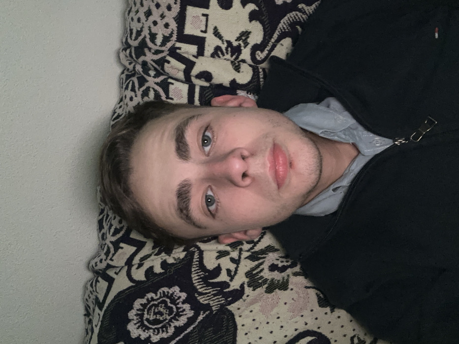 A young man lies on his side on a patterned blanket. He is fair-skinned with light brown hair and blue eyes. He wears a light blue collared shirt underneath a dark-colored jacket. The background features a white wall. The composition is a close-up shot, focusing on the man's face and upper body.