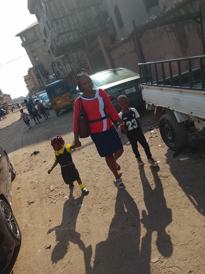 A woman in a red and white top with a blue skirt walks down a dirt street holding the hands of two children. One child, a girl, is wearing a school uniform with yellow accents, and the other child, a boy, is in a white and black sports jersey. Buildings and vehicles line the street in the background. The sun casts long shadows.