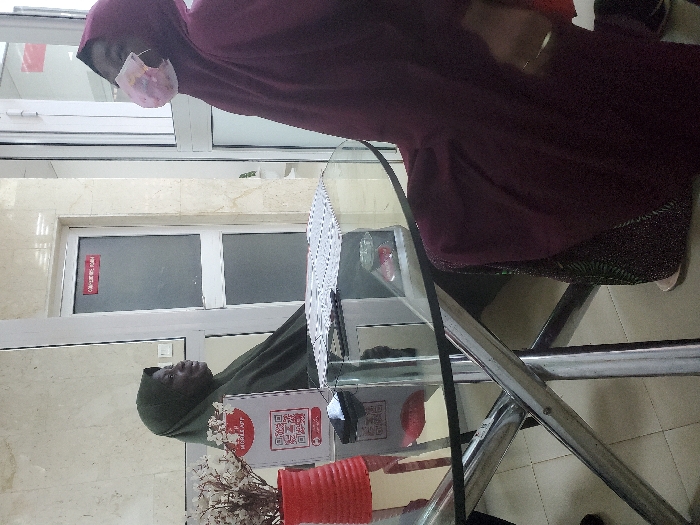 This image depicts an indoor scene with two individuals seated at a round glass table with a chrome base, in what appears to be a waiting area or office setting in Sabon Gari North, Nigeria