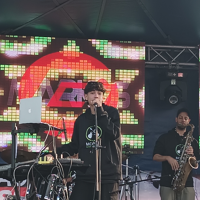 The image captures a live musical performance on an outdoor stage in Carrizal, Venezuela. Two male individuals are present. The central figure is a young male, appearing to be in his late teens or early twenties, with short, dark curly hair. He wears a black hooded sweatshirt with a white circular logo featuring a musical note and crossed sticks, along with the text "MOR ALTER". He holds a black microphone in his right hand, positioned at a microphone stand, and appears to be singing or speaking. To his immediate left, a silver Apple MacBook laptop rests open on a stand, below which are multiple electronic musical devices and various white cables. To the right of the central figure stands another male, appearing to be in his late twenties or early thirties, with short dark hair and light facial hair. He wears a black garment, possibly a t-shirt or hooded sweatshirt, also bearing a similar white circular logo. This individual holds a brass tenor saxophone, with his hands positioned on the instrument's keys. The background consists of a large LED video screen displaying a vibrant, pixelated graphic. This graphic prominently features a large red, textured, semi-circular or arched shape, accompanied by green and yellow rectangular pixel patterns. Below the red shape, the stylized letters "MORF" and a large numeral "5" are visible. Above the stage, black metal trussing is present, supporting a large, black stage light fixture visible on the right side. The overall scene depicts an active musical performance with electronic and live instrumentation.