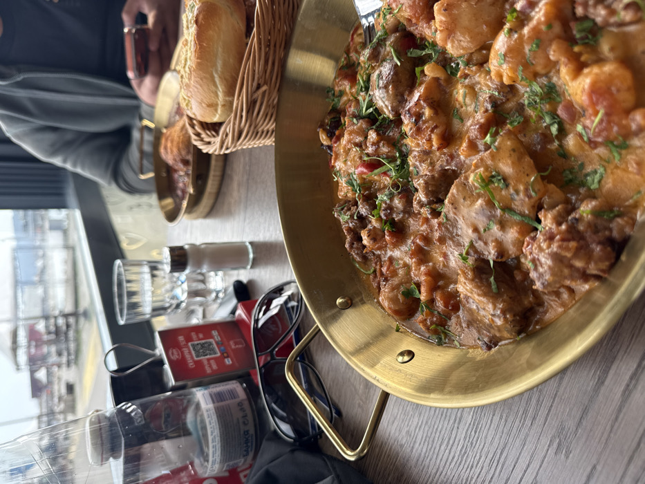 The image depicts an indoor dining scene within a restaurant or cafe in Varna, Bulgaria, overlooking a waterfront area. Through a large window, an outdoor port or marina environment is visible, characterized by paved surfaces, grey industrial structures, and faint distant elements under an overcast sky. In the immediate foreground, a brass-colored pan holds a cooked dish, appearing as a stew or casserole. The dish contains cuts of meat (potentially chicken and minced meat), diced red vegetables, and is covered in a creamy, reddish-orange sauce, garnished with fresh green herbs. A fork is partially visible within the food. The pan rests on a light-colored wooden table. On the table adjacent to the main dish, a small woven basket contains several light-colored bread rolls. Further back, another brass pan, similar in style to the foreground one, holds a darker, possibly baked bean or meat dish, supported by a circular wooden trivet. Other objects on the table include a clear, faceted glass containing water, a small white salt shaker with a metal top, a red rectangular stand displaying a QR code labeled "СКЪНПАД / SCAN" (Bulgarian for "Scanpad / Scan") and various payment logos, a pair of dark sunglasses, and a clear plastic bottle with "БАНКА СЛЪН" visible on its label. A dark fabric item is situated on the far left. A person is partially visible seated across the table, wearing a grey long-sleeved top. They are engaged with a smartphone, which features a red case, held in their hands. The overall scene suggests a meal in progress within a waterfront establishment.