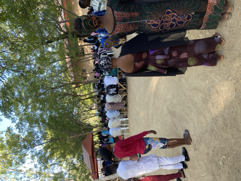 People are seated in rows of white chairs outdoors, under trees. Most face the same direction. They are dressed in a variety of clothing, including traditional African prints, white shirts, and casual attire. A tent-like structure is visible on the left. The ground is sandy. The scene suggests a gathering or event taking place outdoors.
