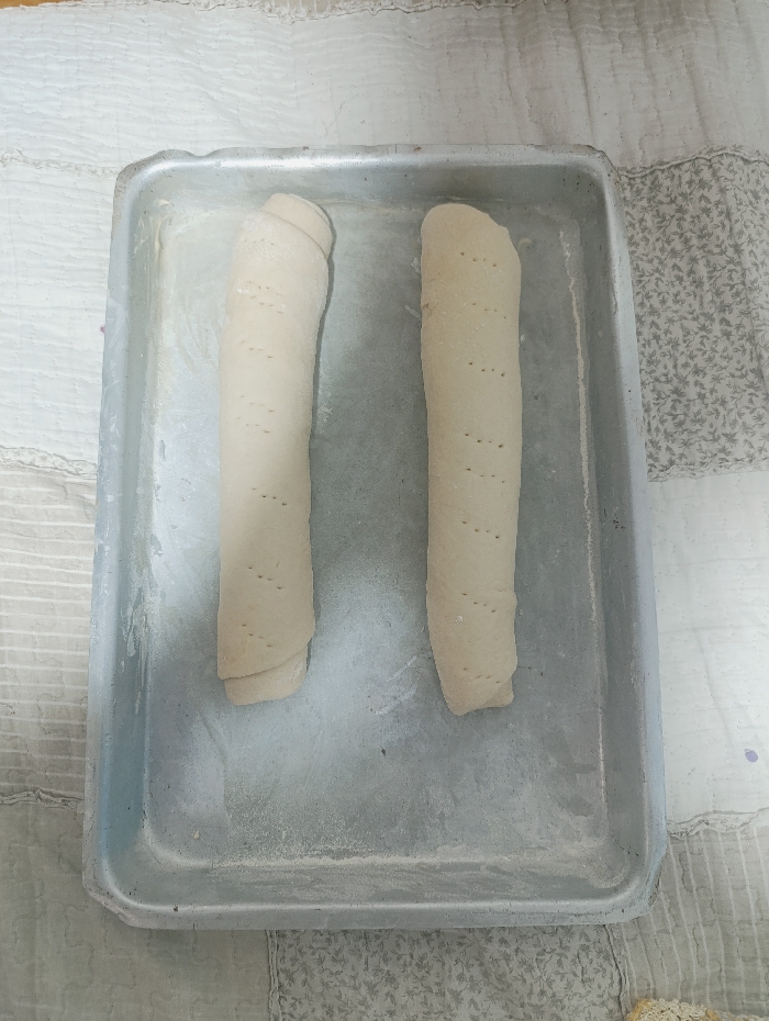 Two rolls of uncooked dough sit in a rectangular baking pan. The dough appears to be pale and has small perforations along the top. The pan is slightly worn, with a dull silver color, and a thin layer of flour covers the bottom. The pan sits on a surface covered with a wrinkled cloth or quilt.