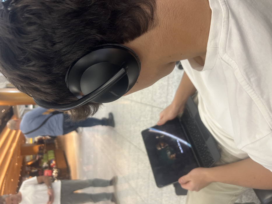 A person wearing black Bose headphones and a white shirt is holding a tablet with a keyboard in their lap. The tablet screen is displaying content. The image appears to be taken from an overhead perspective. In the background, blurred figures of people walking by are visible, along with elements suggesting an airport or shopping mall environment. The floor appears to be tiled.