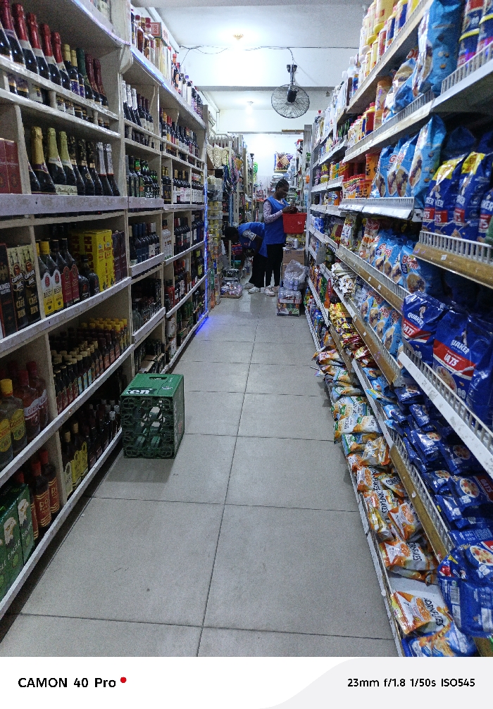An aisle in a store is lined with shelves. The left shelves hold various bottles of alcohol and beverages. The right shelves contain cereals and snacks in colorful packaging. A green crate sits on the floor. At the end of the aisle, two people in blue uniforms stand near boxes and goods, seemingly restocking or organizing items. A ceiling fan hangs overhead in the brightly lit space.